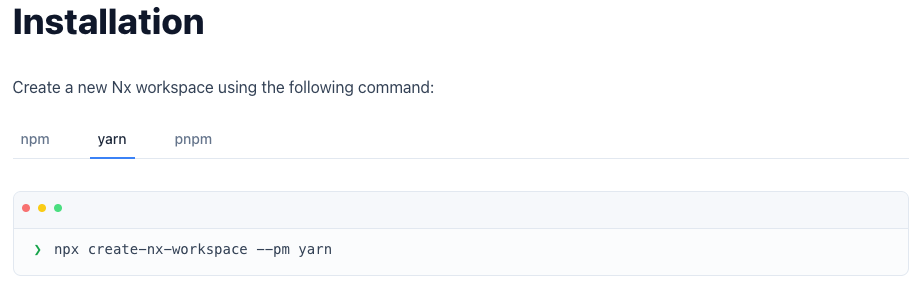 For example, if you are working with yarn, when you select the yarn tab on the Installation Page, all pages will adapt and display yarn commands by selecting yarn tabs.