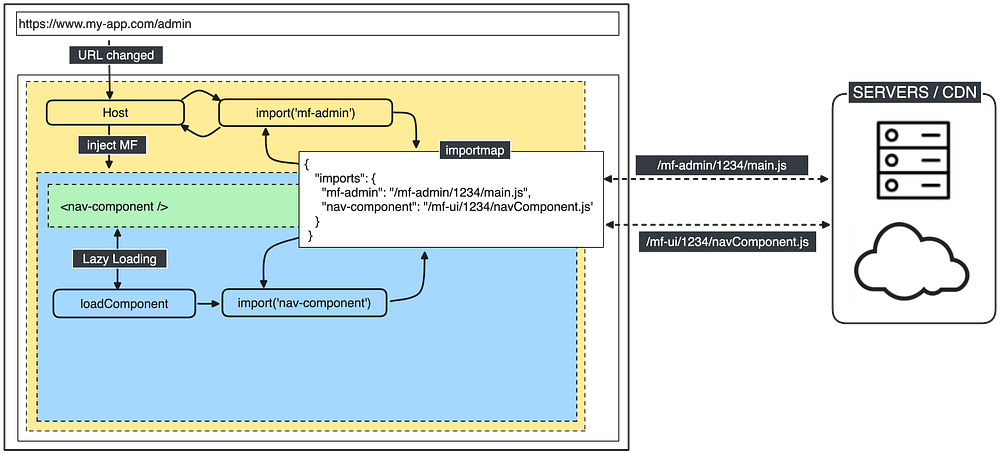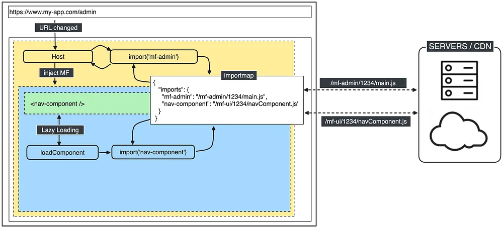 This orchestration is the role of the Host. However, when the host needs to load an ES module, it can simply utilize the JS import system and, with the aid of the import map, map the module to its location